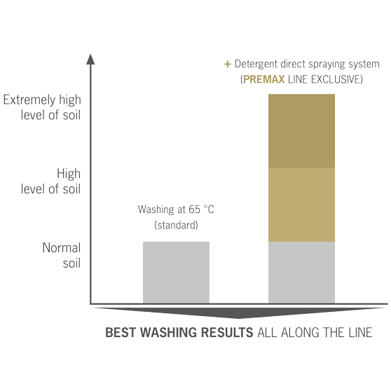 Le lavautensili PREMAX spruzzano una soluzione detergente concentrata direttamente sugli utensili. Questa soluzione liquida attacca lo sporco residuo prima che venga sciacquato via dal lavaggio a vapore.