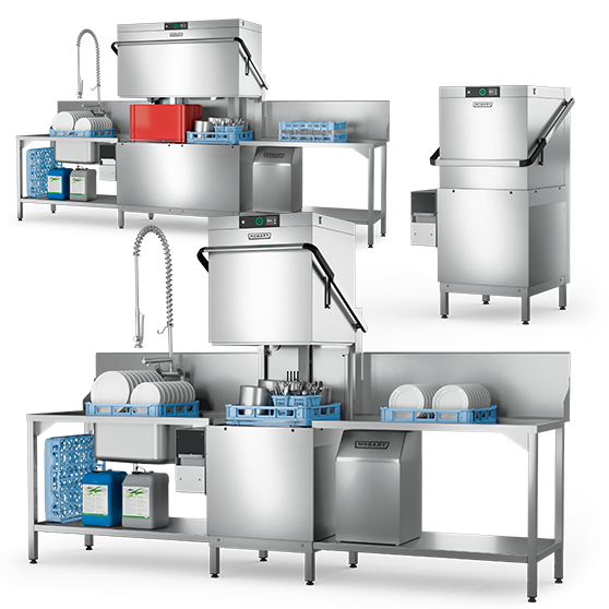 Le lavastoviglie a capote di HOBART possono essere installate in qualsiasi punto della cucina e regolate in base al flusso di lavoro. Oltre all'installazione lungo una parete tra i tavoli di carico e scarico, tutte le lavastoviglie a capote possono essere integrate in una serie di tavoli come installazioni angolari.