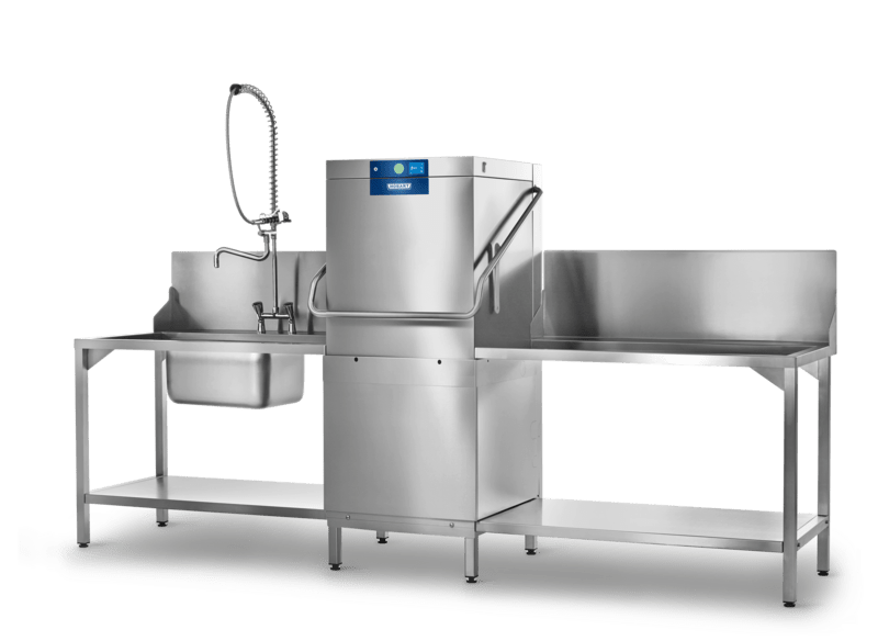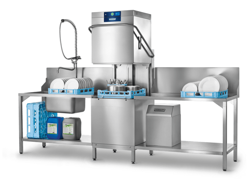 (Opzionale) Sollevamento automatico della capote: Semplicità d‘uso e risparmio energetico: con il sistema di sollevamento automatico della capote di HOBART, opzionale, è possibile chiudere la lavastoviglie a capote semplicemente premendo un pulsante. Dopo il lavaggio, la capote si apre automaticamente